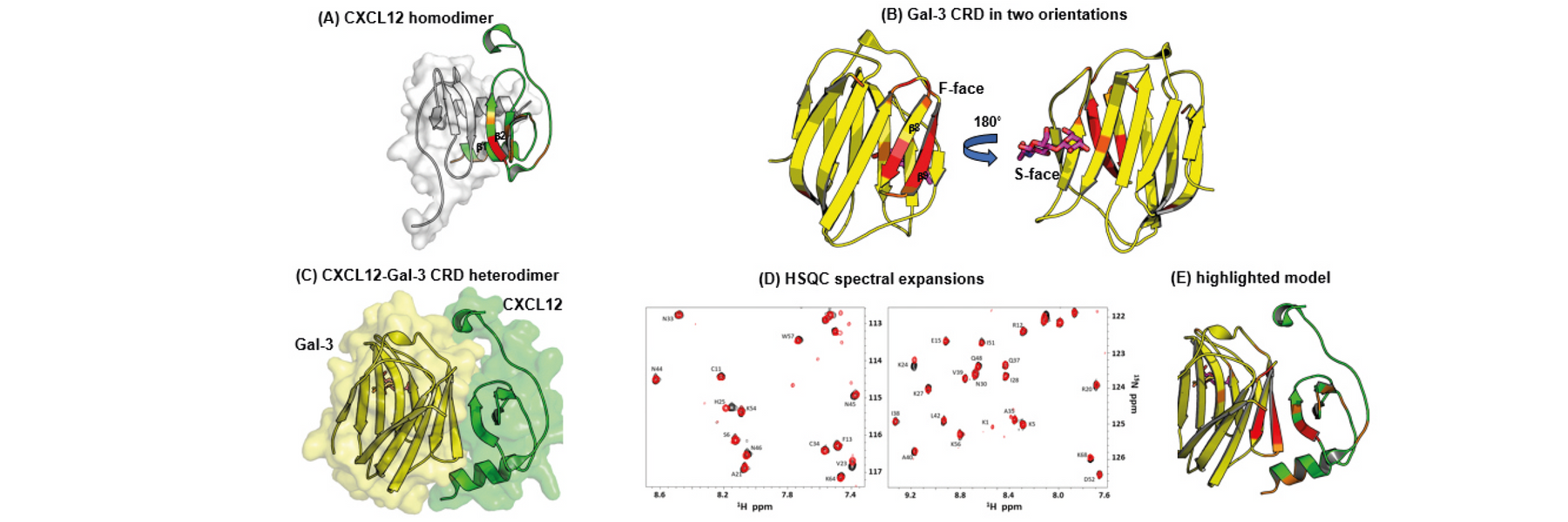 Heterodimer by CXCL12-Gal-3 CRD association. (A) The crystal structure of the CXCL12 homodimer (PDB code 4UAI) is shown with one monomer subunit highlighted in green and red. (B) The structure of the Gal-3 CRD (in yellow and red) bound with lactose (in magenta) (PDB code 1A3K) is shown. (C) A model of the heterodimer formed between CXCL12 (green) and Gal-3 (yellow) derived from NMR-directed protein-protein docking, MD simulations and BFE calculations is shown. (D) Spectral expansions of HSQC data of 15N-labelled CXCL12 in the absence (black contours) and presence (red contours) of unlabelled Gal3 CRD are shown. (E) The NMR-based heterodimer model is shown with residues that are most perturbed by interactions between Gal-3 and CXCL12 highlighted in red and orange