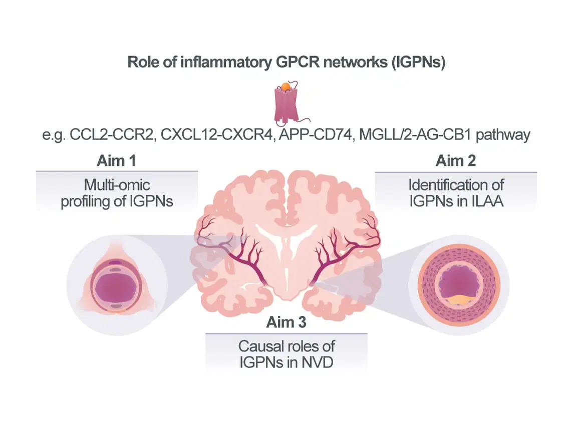 Our overarching goal is thus to comprehensively profile IGPNs in NVDs and identify candidate IGPN components as potential future therapeutic targets. Capitalizing on tissue, mouse and cell model resources in the CRC, we will first profile IGPNs in cSVD and study the regionality of candidate chemokines, lipid mediators, and their receptors (Aim 1). Furthermore, we will establish experimental in vivo and in vitro models of ILAA and obtain human ILAA biobank specimens to extend IGPN profiling to another neurovascular condition and define IGPN differences between extra- vs intracranial atherosclerotic vascular segments (Aim 2). Pre-identified targets such as CXCL12/CXCR4, MIF/CD74, or the MGLL/2-AG/CB1 axis will be studied for causality by hypo-thesis-driven pharmacological blocking approaches (Aim 3), which will be extended to selected segment-specific chemokines or lipid agonists identified in Aims 1/2. We expect to obtain novel information on IGPNs in cSVD, examine their patterns in different arterial regions to understand their role in ILAA, and explore therapeutic strategies based on identified causal IGPN pathways.